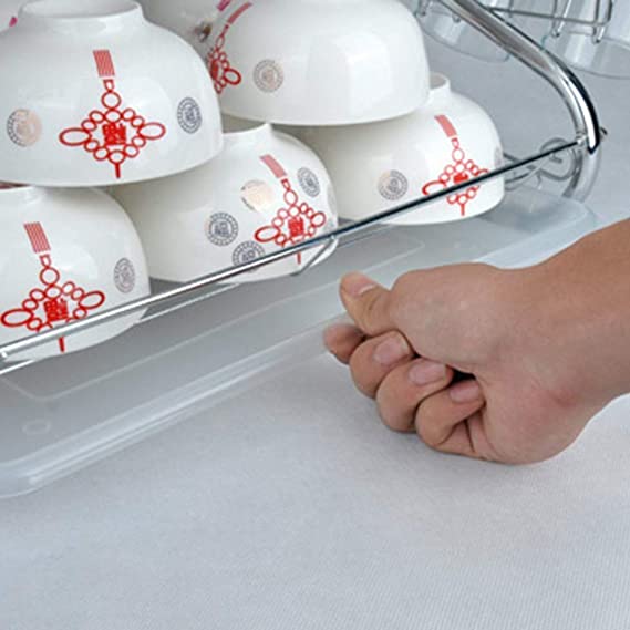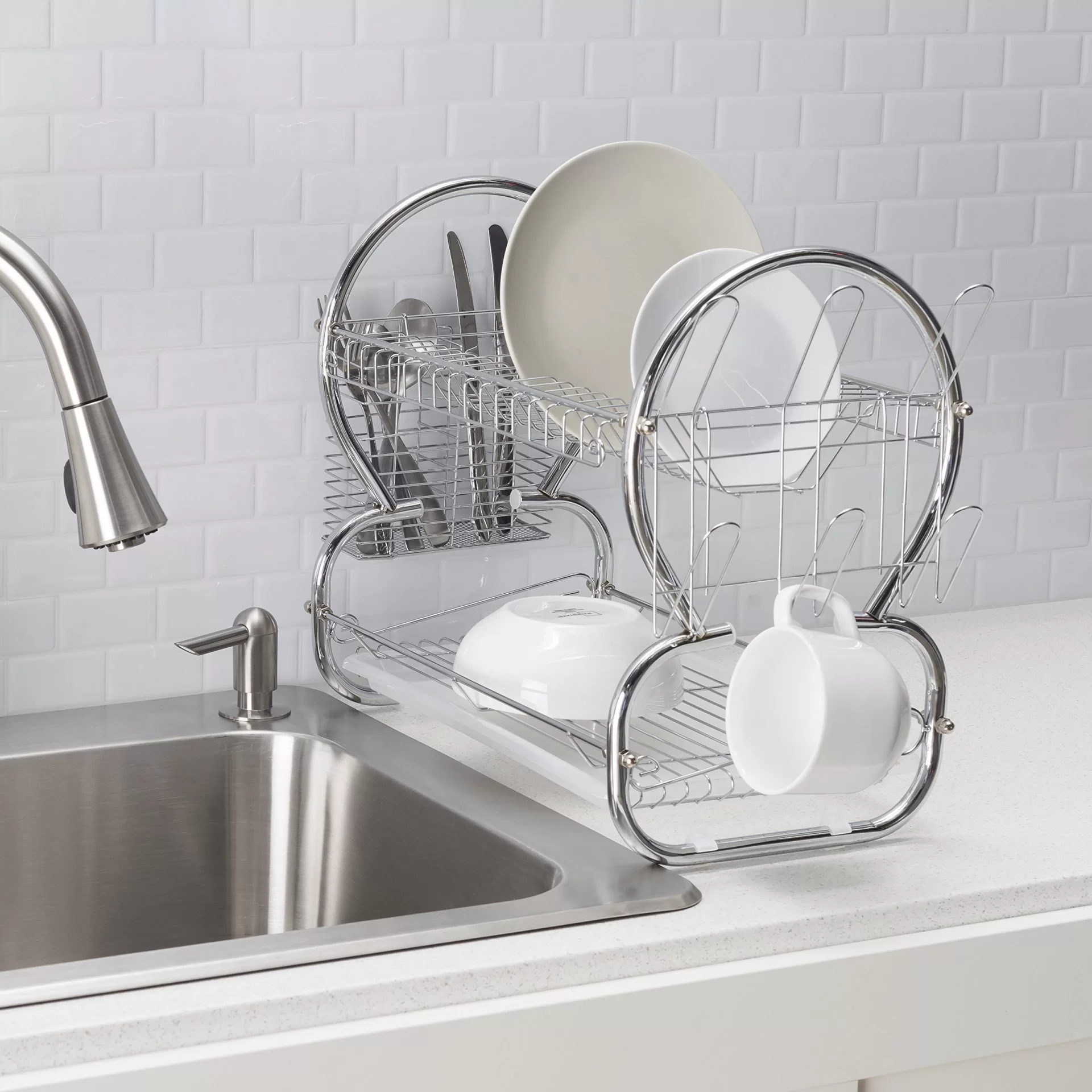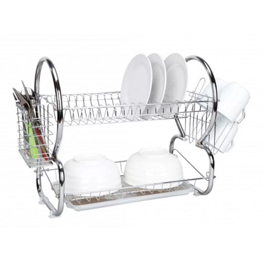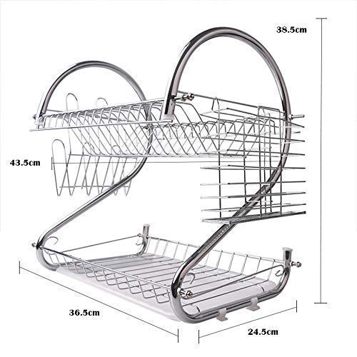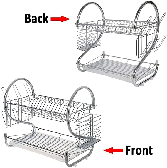 Perfect for air drying and organizing dishware Two levels of storage for twice as much room for air drying dishes Side-mounted cutlery holder holds utensils and silverware Made of sturdy chrome plated steel